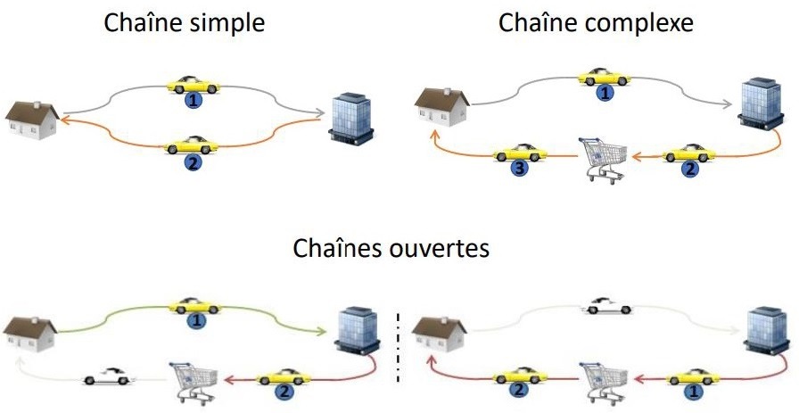 Étude des séquences de déplacements urbains s’amorçant et se finissant au domicile. Ces chaînes peuvent être ouverte, fermée, indéterminée, simple ou complexe. Chaque chaine comporte un point pivot appelé Point d’ancrage qui est associé à deux ou plusieurs déplacements. Une fois qu’une chaîne de déplacement s’amorce et se termine au point d’ancrage, elle est dite chaine en boucle; Elle peut être mono ou multi boucle. Cette étude permet également de géolocaliser les activités dans le but de déterminer le motif ou raison de déplacements. Les déplacements s’effectuent souvent dans le but d’atteindre les activités Primaires (travail ou études, etc.), secondaires, contraintes, non-contrainte.